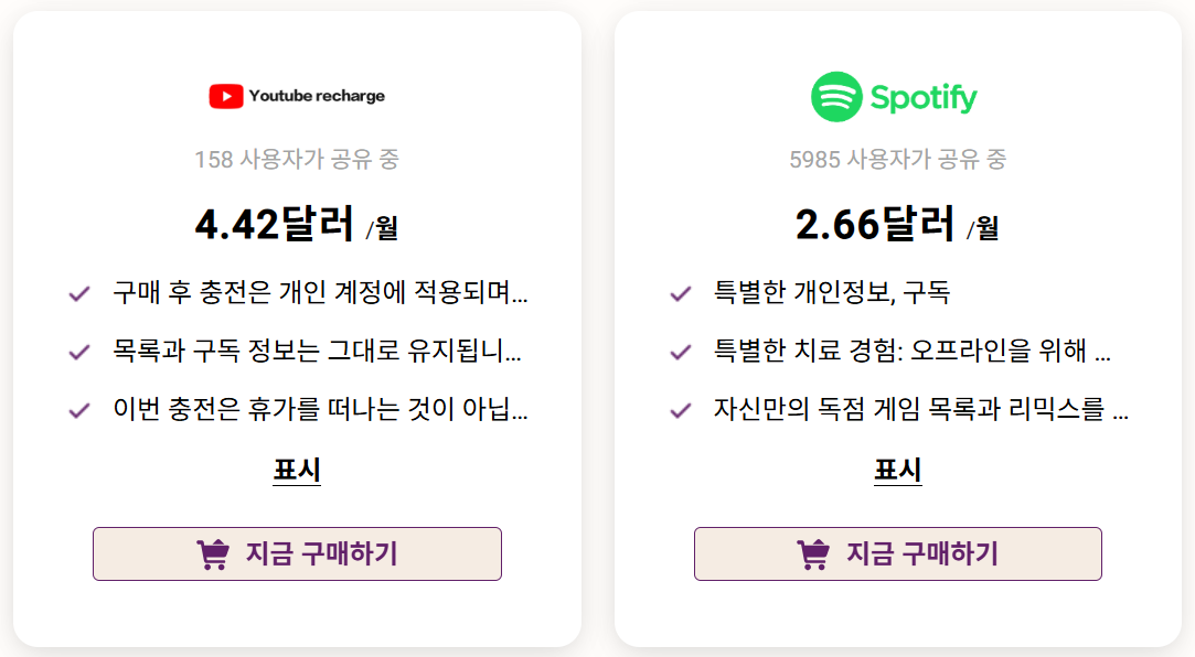 - 서비스 선택 : 넷플릭스, 유튜브 프리미엄, 디즈니 플러스 등 원하는 서비스를 선택합니다.