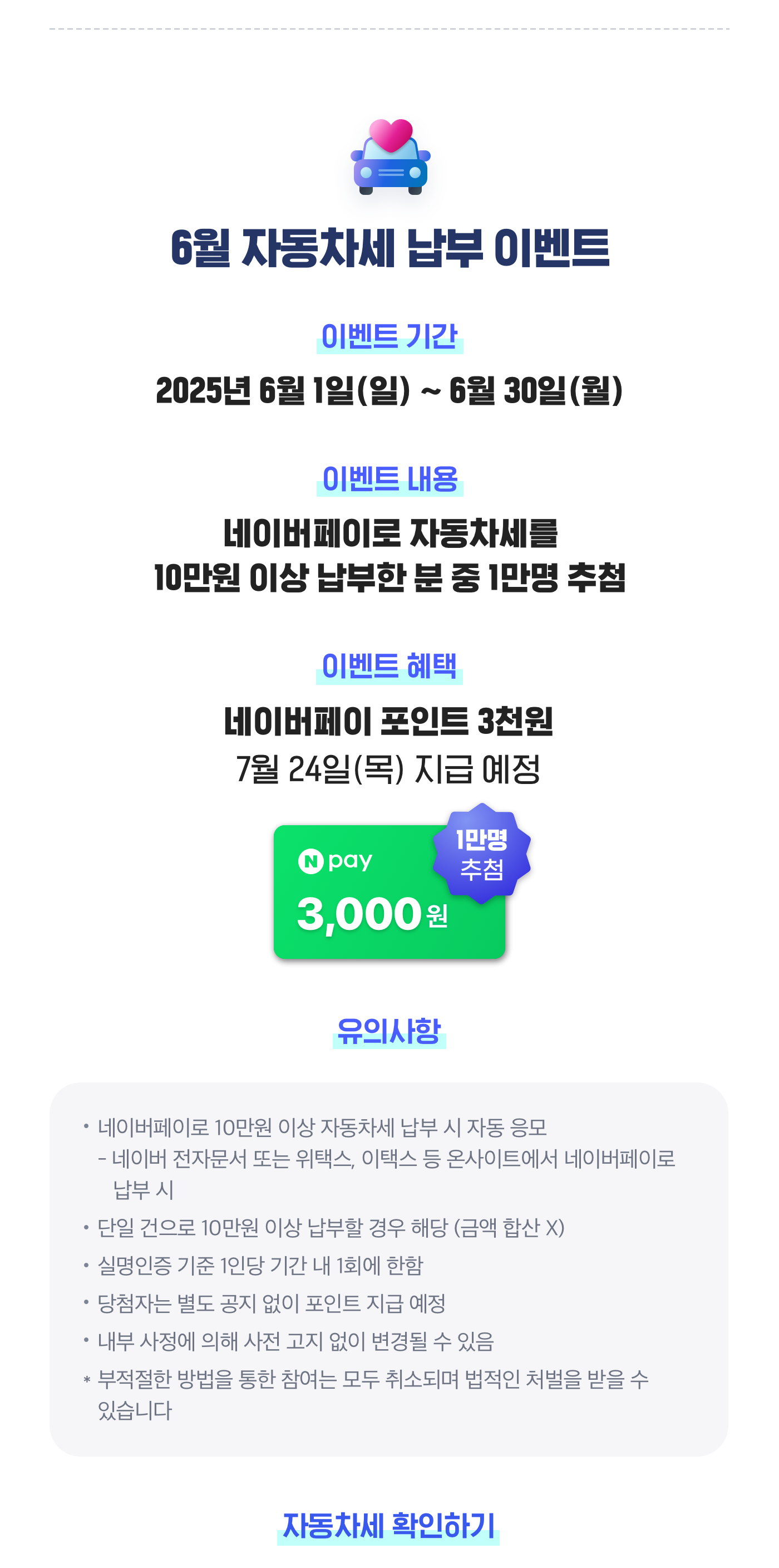 | 2025년 6월 1일 ~ 6월 30일 | 네이버페이 사용자 누구나 | 자동차세 납부 시 3,000P 적립 | 건당 10만원이상 |