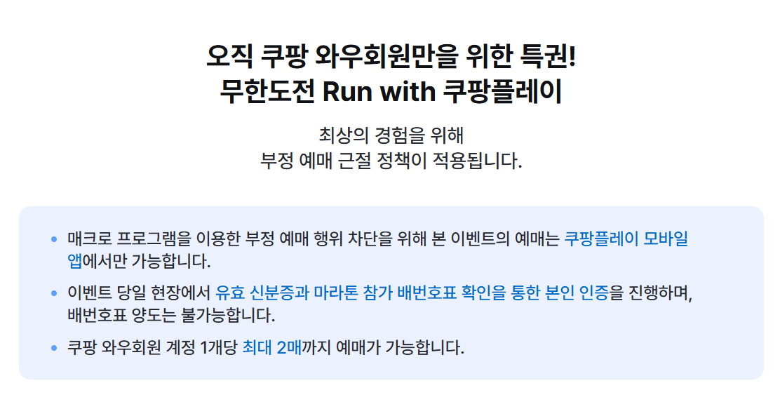 쿠팡 와우회원 계정 1개당 최대 2매까지 예매 가능 티켓 수가 제한됩니다.
