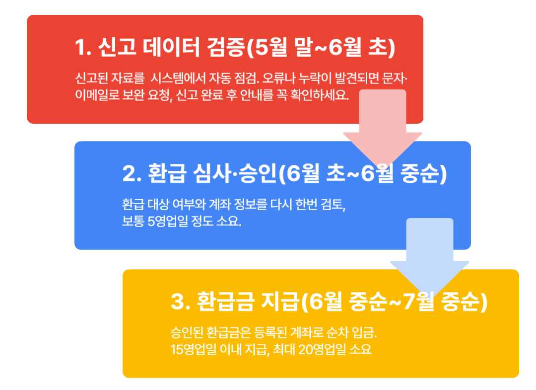 승인된 환급금은 등록된 계좌로 순차 입금됩니다. 일반적으로 15영업일 이내 지급되지만, 신청 폭주 시 최대 20영업일까지 걸릴 수 있습니다.